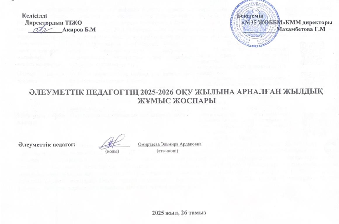 Әлеуметтік педагогтың 2025-2026 оқу жылына арналған жылдық жұмыс жоспары » Средняя общеобразовательная школа № 35