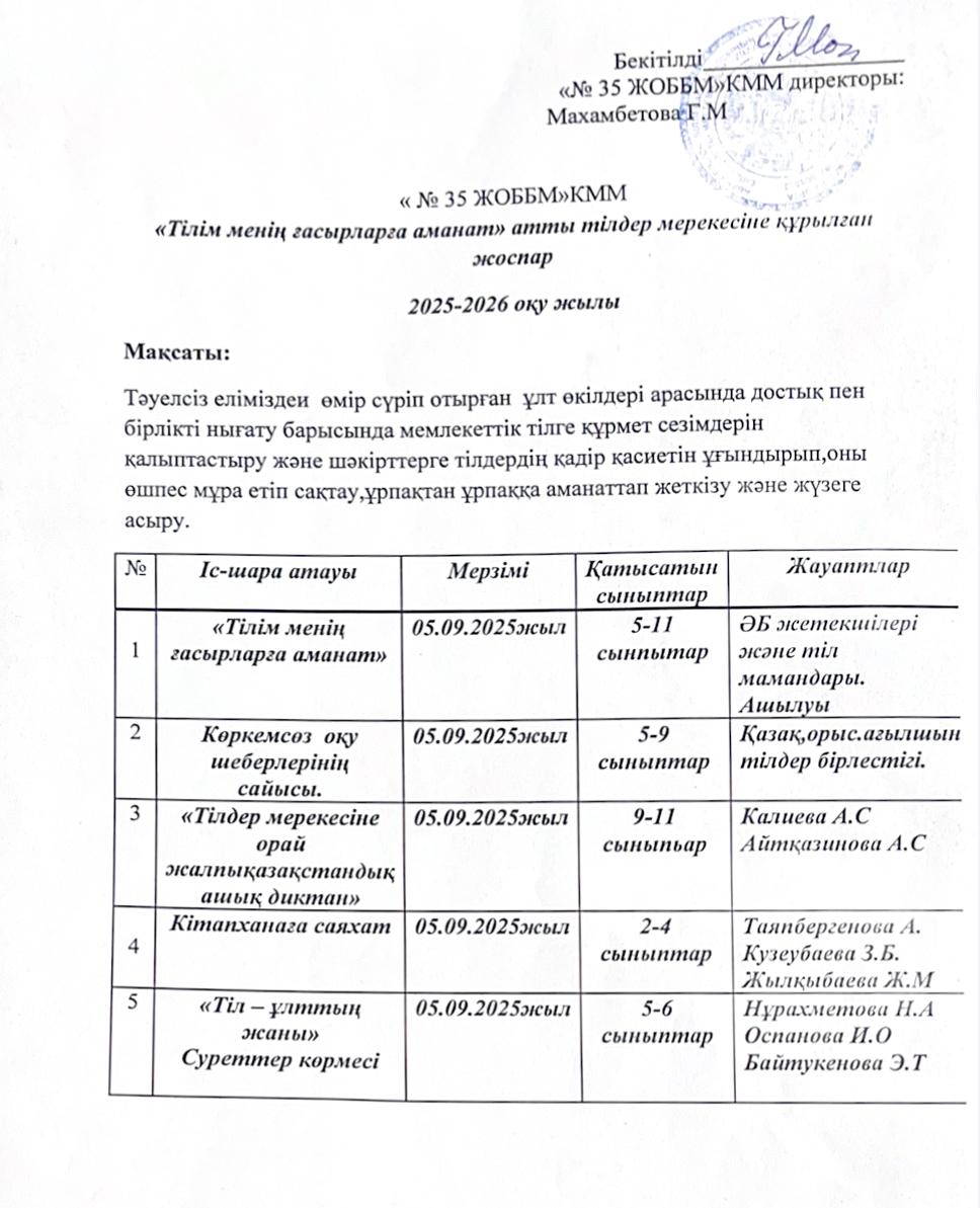 07 ноябрь 2025 «№35 ЖОББМ» КММ «Тілім менің ғасырларға аманат» атты тілдер мерекесіне құрылған жоспар