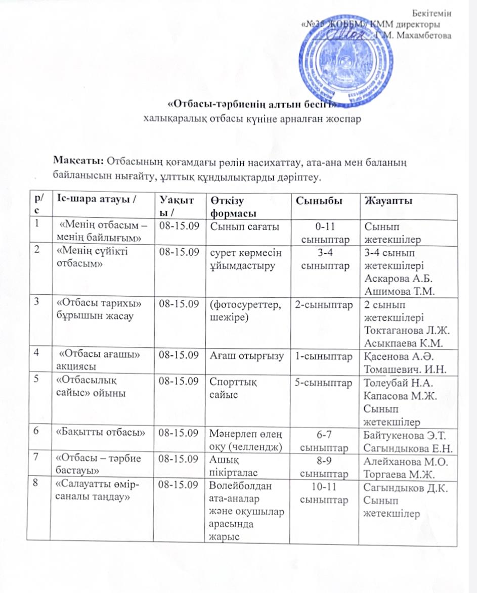 » » «Отбасы-тәрбиенің алтын бесігі» халықаралық отбасы күніне арналған жоспар