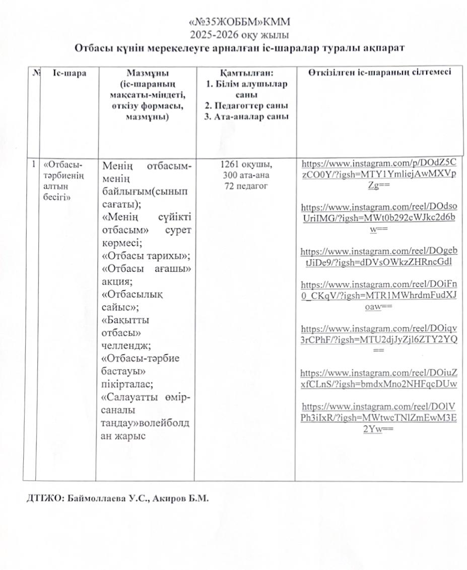 «Отбасы-тәрбиенің алтын бесігі» халықаралық отбасы күніне арналған жоспар » Средняя общеобразовательная школа № 35