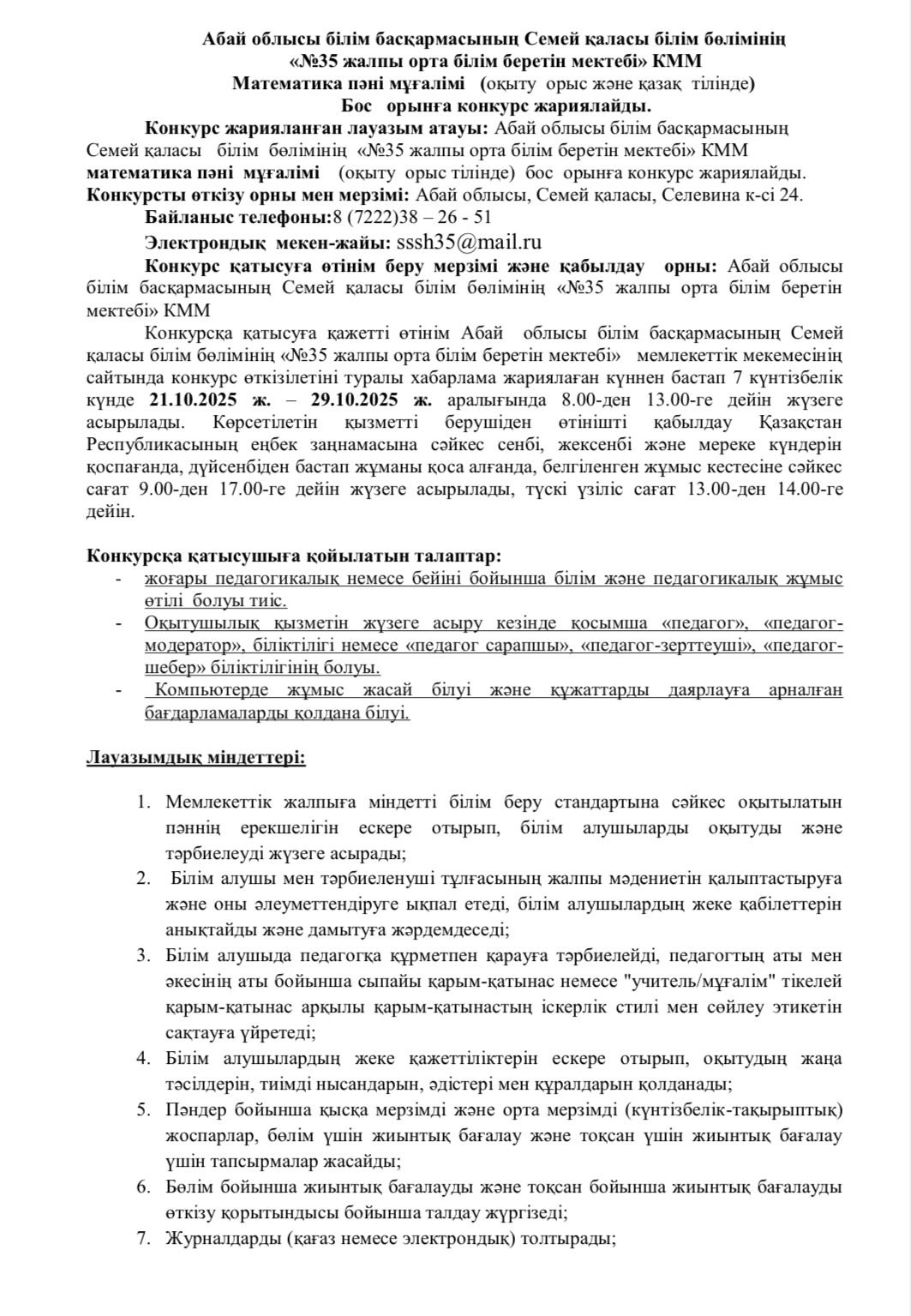 Абай облысы білім басқармасының Семей қаласы білім бөлімінің «№35 жалпы орта білім беретін мектебі» КММ Математика пәні мұғалімі (оқыту орыс және қазақ тілінде) Бос орынға конкурс жариялайды. » Средняя общеобразовательная школа № 35