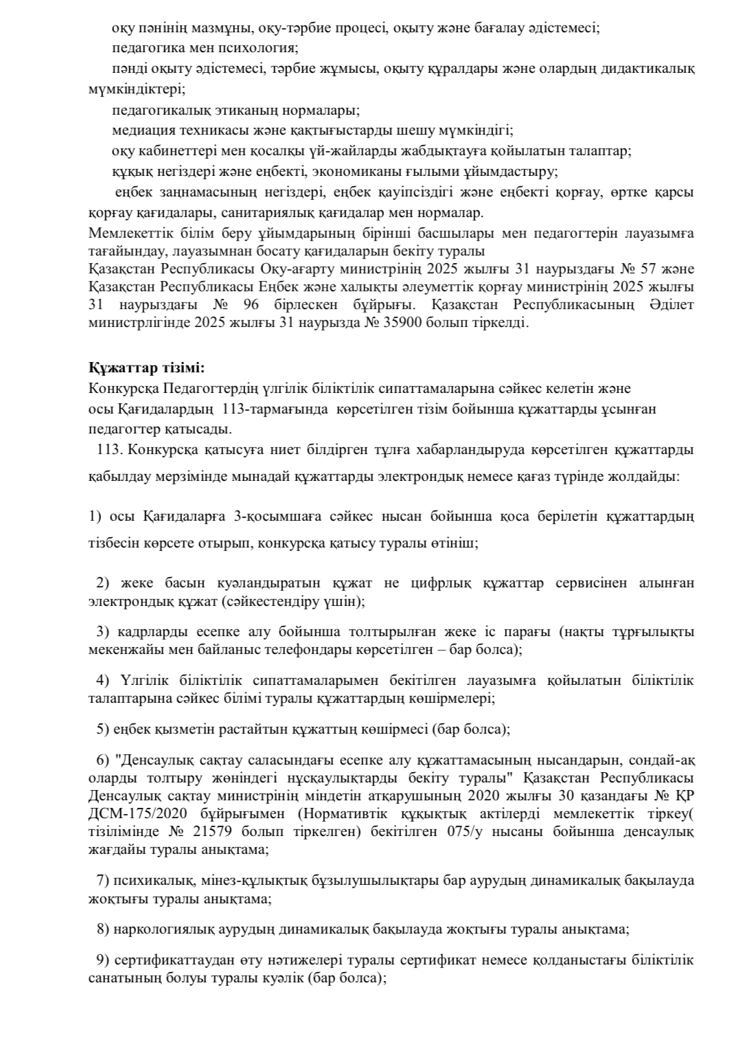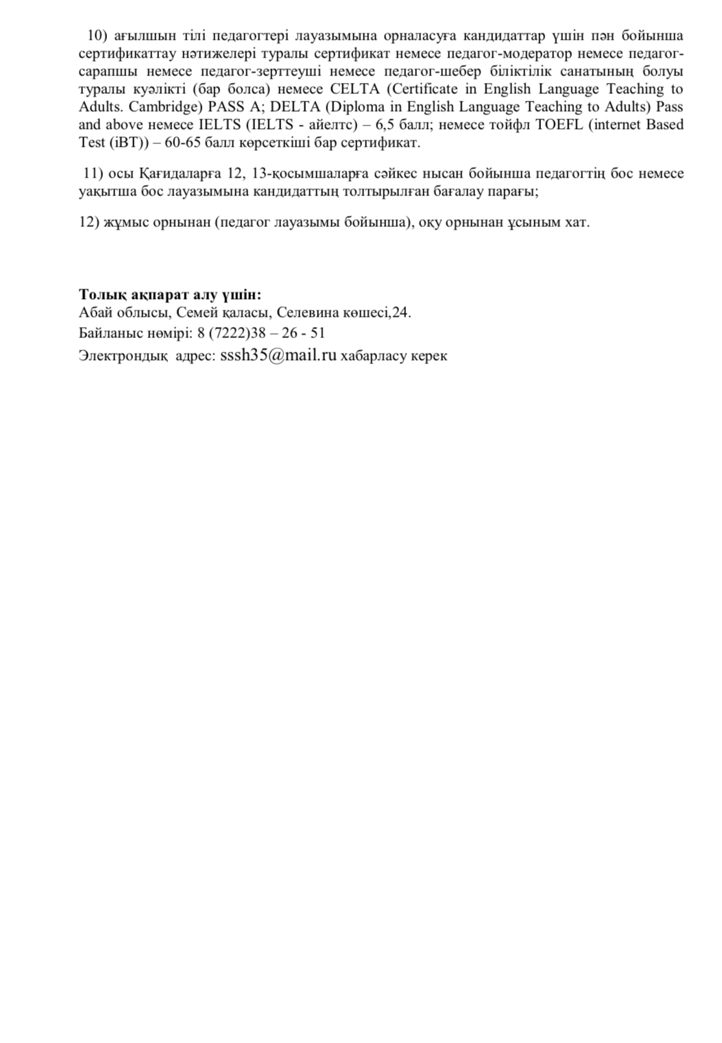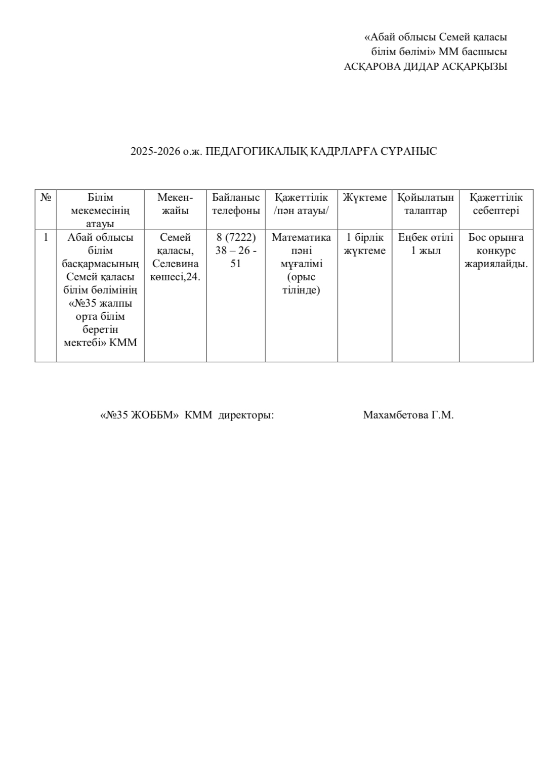 Средняя общеобразовательная школа № 35 » Хабарламалар/ Информация » Абай облысы білім басқармасының Семей қаласы білім бөлімінің «№35 жалпы орта білім беретін мектебі» КММ Математика пәні мұғалімі (оқыту орыс және қазақ тілінде) Бос орынға конкурс жариялайды.