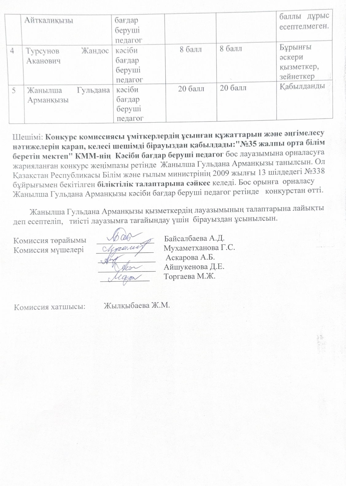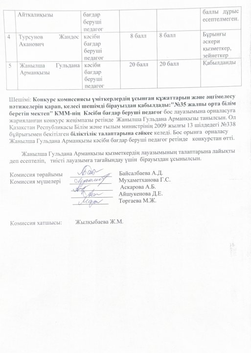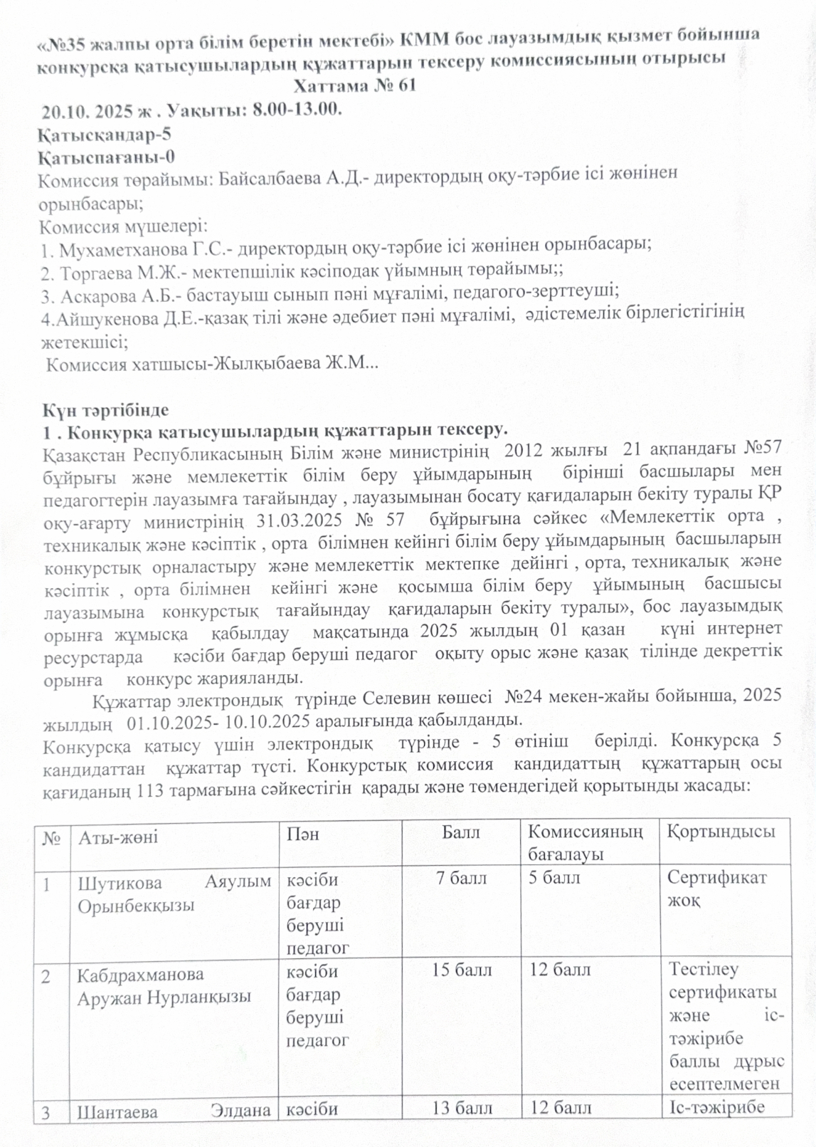 21 октябрь 2025 «№35 жалпы орта білім беретін мектеп» КММ Бос лауазымдық қызмет бойынша конкурсқа қатысушылардың құжаттарын тексеру комиссиясының отырысы «№35 жалпы орта білім беретін мектеп» КММБос лауазымдық қызмет бойынша конкурсқа қатысушылардың құжаттарын тексеру комиссиясының отырысы