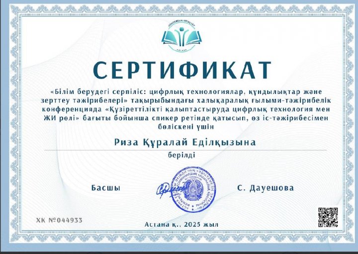 Астана қаласында өткен “Білім берудегі серпіліс: цифрлық технологиялар, құндылықтар және зерттеу тәжірибелері” атты халықаралық ғылыми-тәжірибелік конференцияда Жылқыбаева Жаннұр Мәдиқызы мен Риза Құралай Еділқызы спикер ретінде қатысып, “Құзыреттіліктерді қалыптастыруда цифрлық технология мен жасанды интеллекттің рөлі” бағыты бойынша өз іс-тәжірибелерімен бөлісті. Конференцияға белсенді қатысқаны үшін педагогтерге арнайы сертификаттар табысталды.